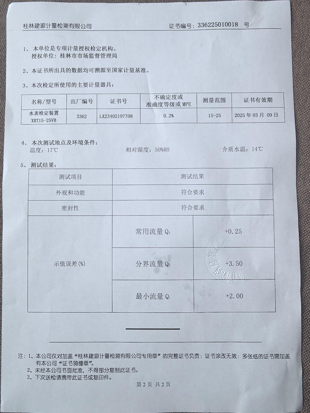 桂林建源计量检测有限公司的测试证书显示,今年1月17日,该公司对黄先生家的水表进行检测。水表由桂林市桂水流量仪表有限公司制造,是液封立式(LXSL-F型水表)。检测结果中,水表的外观和功能、密封性均“符合要求”。